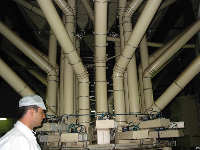 Les grains sont aspirés par les tuyaux de l’assembleur. C’est le cœur de la migale. Ses pattes sont des tubes qui acheminent les différents types de café en fonction des proportions décidées pour chaque assemblage. Ils sont envoyés dans la machine à torréfier. On les entend passer comme si la grêle tombait sur le toit.