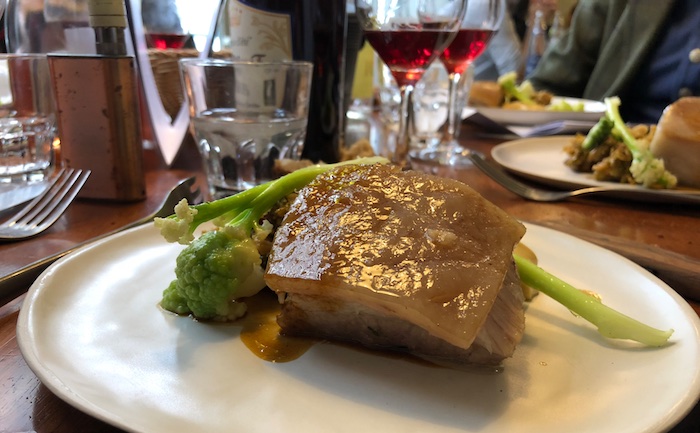 De quoi accompagner une cuisine qui ici marque les mémoires. Grâce à un chef finlandais, Marlo Snellman, dont l’approche est franche et entière, toute en saveurs sincères. C’est généreux comme la terrine maison ou juteux comme la ventrèche de cochon basque du charcutier d’Eric Ospital avec un gras suave comme la hanche d’une Messaline aux thermes. En hiver, c’est une cuisine qui puise son inspiration dans une géographie continentale. A cette déclinaison du chou, choux-fleur rôti, langue de bœuf chou fermenté et mayo coriandre, sans oublier le chou romanesco accompagnant la pintade fermière du Périgord. Et quand ce n’est pas du chou, c’est du topinambour qu’il caramélise pour accompagner un lieu noir. En dessert, par jour de chance, on peut tomber sur une ganache noire et caramel au beurre salé. Tout simplement la bonne surprise.