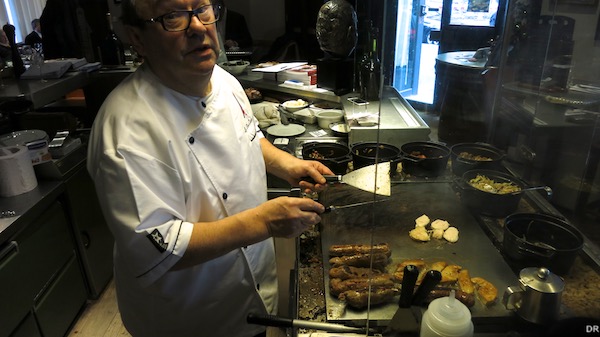 Le bonhomme n’est pas toujours facile. Quand le rôtisseur prend un coup de chaud, l’humeur patronale peut se transmettre au personnel … Rien de rédhibitoire, car la salle vaste et claire, amortit les tensions. Dans ce bistrot cossu où les tables sont espacées, on prend le temps de se poser. Les statuettes des personnages de Tintin ou de Coluche et Gainsbourg participent à l’atmosphère.