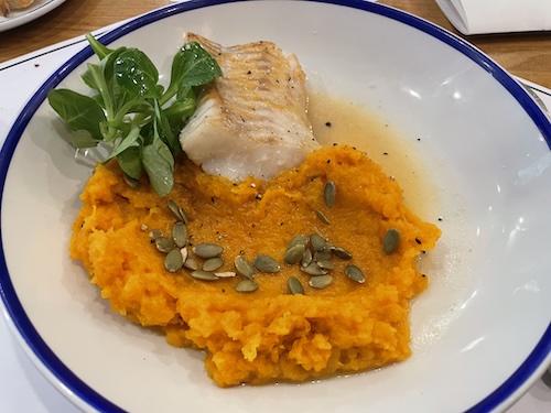 Mais ce sont surtout les assiettes qui font la joie des papilles. Intelligentes et savoureuses comme ce poisson du jour, de la lingue bleue. Un poisson blanc à la texture semblable au cabillaud qui excelle en suavité avec sa sauce à base de fumets de poissons version asiatique car rehaussée de gingembre,  soja et mirin. Elle vient agréablement trancher le goût sucré du butternut qui l’accompagne.