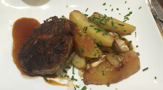 bourpif_pied_porcsEn plats, tout dépend de la saison. Une galette de pieds de porcs (18€) délicieuse et onctueuse encore entourée de gousses en chemise fait de beaux passages de témoin sur la langue avec le Vinsobres, domaine Chaume Arnaud. Alors, il y a aussi la salade tiède de langue de veau aux légumes printaniers (20 €) ou un foie de veau (24€) poêlé mais tendre et accompagné de pois gourmands au chorizo.