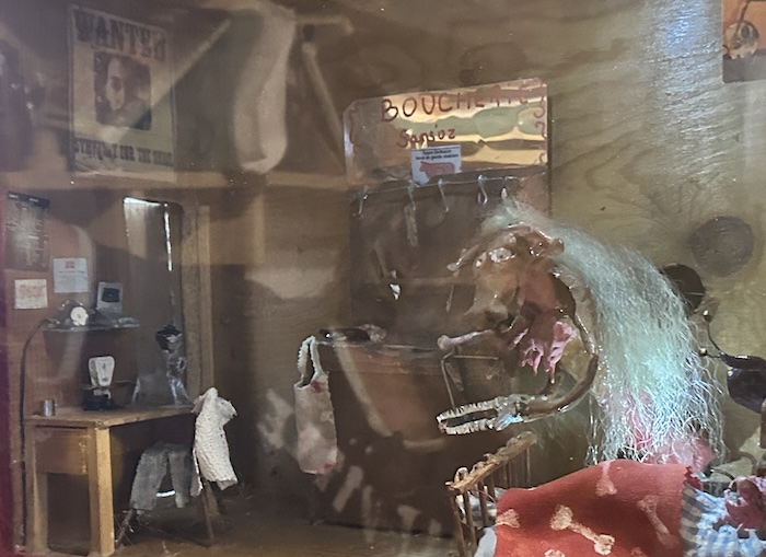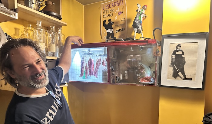 Le bonhomme sur son quant-à-soi de prime abord dissimule mal une légère couche de dinguerie attachante. Il vous montre ses petites maquettes de fer forgé réalisées par un copain dinandier. Et notamment cette scène qui comblera de joie les végétariens où les rôles sont inversés à la boucherie…