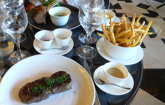 Le menu propose des assiettes qui tiennent la route. Faute d’être roboratives, la précision de leurs goûts vient là encore d’un souci du détail qui se mesure dès la salade. Et que l’on retrouve ensuite dans un carré d’agnelet d’Aveyron fèves fraîches (29€) ou un quasi de veau cuit au four aux girolles (25€). Le faux-filet de bœuf (origine UE) est aussi bien travaillé. Bonne surprise et bel effort pour ces patrons auvergnats, les frites maison sont à discrétion. A base de pommes de terres spunta, elles se signalent par leurs longueurs exceptionnelles qui rappellent les jambes des serveuses.  Long aussi est l’éclair au chocolat (12 €) comme la sensation voluptueuse qu’il procure.