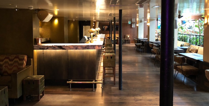Mais une brasserie qui aurait intégré quelques éléments d’inspiration tropicale. En témoigne la cascade de plantes vertes tombant du puits de lumière central. A l’étage, le long bar stylé de marbre rose et les petites tables dans la pénombre permettent d’imaginer de beaux instants cocktails.