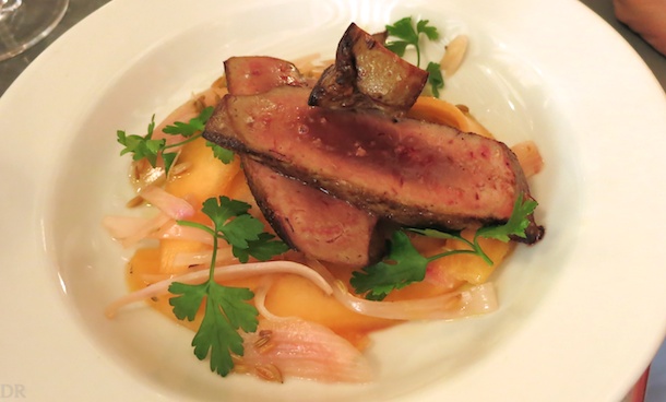 Il a une sorte de folie à la Ken Russell cultivant des accords que seul un Anglais ose imaginer, comme ce foie d’agneau servi sur un matelas de lamelles de melon charentais. Explosif. Mais sa cuisine rappelle aussi que le british aime la sensualité de l’iode y compris nippone – comme cet otoro de thon en sashimi (15€), fèves et oignons nouveaux à l’assaisonnement juste. Dommage que les couteaux à la plancha soit un peu trop élastiques… L’œuf 69 sur son lit de lentilles mérite également le détour.