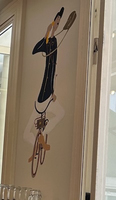 En témoignent l’air satisfait des clients ou le rire des copines de boulot au déjeuner. Le bistrot a été décoré avec l’esprit d’une douce nostalgie éclairée de néons sixties. S’y distille ainsi un esprit léger et facétieux français comme le facteur du Jour de Fête de Tati joliment interprété sur les murs par un/une artiste doué/e. Ces touches artistiques ajoutent une part d’allégresse bienvenue par les temps qui courent et singularisent ce bistrot de quartier pas snob pour un sou qui attire encore à son zinc d’honnêtes poivrots des environs qui viennent y pratiquer leur lever de coude quotidien.