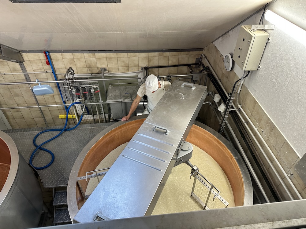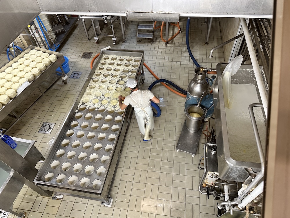 Au bout de quelques minutes, le caillé est ensuite versé par gravitation pour être mis en moules. Le petit lait est évacué par dessous. Démoulées et tassées, les tomes sont salées soit à la main soit par immersion dans un bain de saumure. « Mouillée », la tome pèse encore 1,8 kg. Avec le sel, elle va perdre entre 500 et 600 grammes.