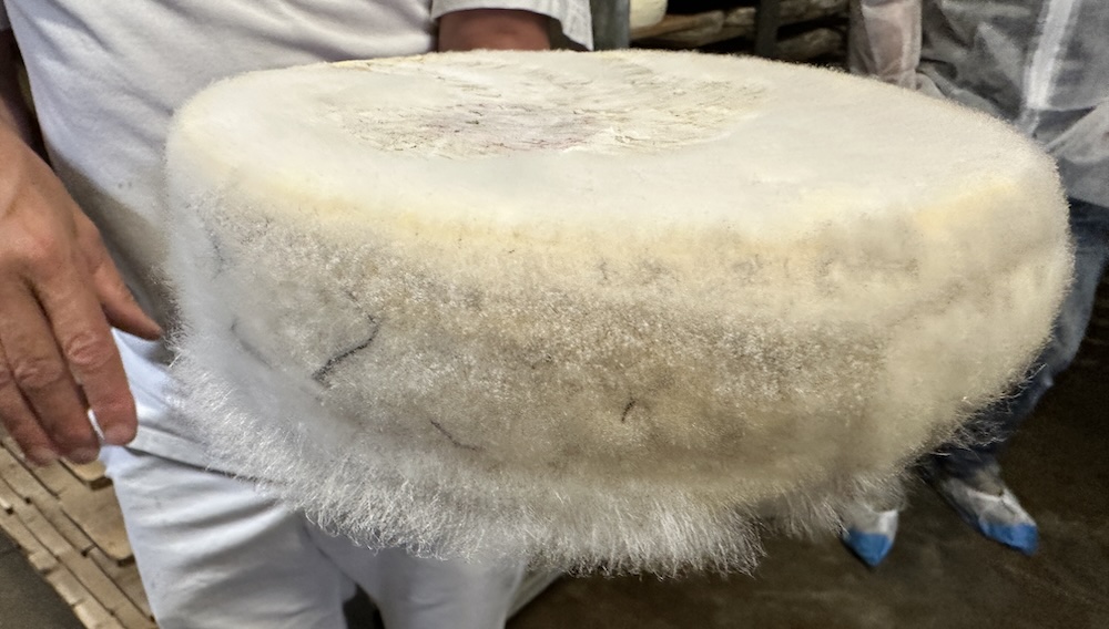 Elle est ensuite déposée sur une planche d’épicéa pour un affinage de 35 jours minimum. Trois fois par jour pendant les trois premières semaines, les tomes sont retournées à la main. Peu à peu, le mucor appelé aussi « poil de chat, l’équivalent de la fleur du saucisson recouvre la tome. En le frottant, le fromager va disperser la moisissure sur les tomes plus récentes. L’une des missions du fromager est de veiller à ce que l’humidité des fromages soit homogène.