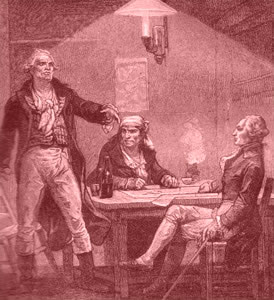 Danton, Marat et Robespierre«Il y avait rue du Paon un cabaret que l’on appelait café. Ce café avait une arrière chambre, aujourd’hui historique. C’était là que se rencontraient parfois à peu près secrètement des hommes tellement puissants et tellement surveillés qu’ils hésitaient à se parler en public. C’était là qu’avait été échangé, le 23 octobre 1792, un fameux baiser entre la Montagne et la Gironde…»