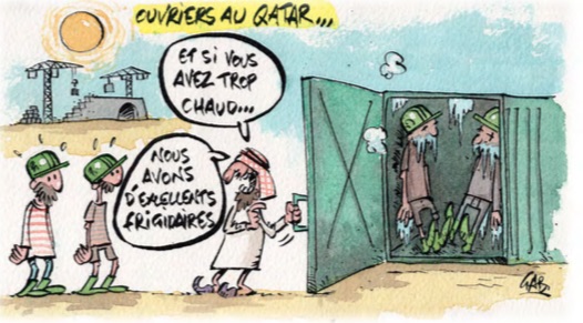 Qui en douterait encore ? Cette coupe au Qatar sent le soufre. Et l’ouvrage pondu par deux Francs Mâchons parisiens  tombe à point nommé pour s’y retrouver dans ce  panier de crabe où le football semble loin de toute humanité. Alain Leiblang ancien journaliste sportif ayant travaillé à la Fifa donne toutes les clés pour comprendre ce Mondial, sac de nœud et nid de vipères. De l’achat des voix avant le choix du pays organisateur,au sort des ouvriers décédés sur le chantier mais le plus souvent, dupés, volés et maintenant virés…  Le coup de crayon de Gab, néophyte du foot, vient opportunément ajouter une couche d’humour corrosif qui permet d’éviter le haut-le-cœur.