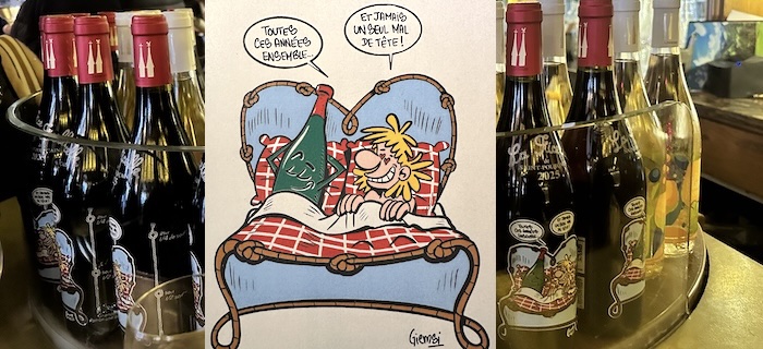 En 39 éditions, la Ficelle de Saint-Pourçain n’a pas lâché. Et cette année encore, la célèbre bouteille auvergnate sérigraphiée est sur les tables bistrotières depuis le 6 décembre. C’est Giemsi qui prête cette année son coup de crayon à La Ficelle. Auteur de bande dessinée et dessinateur de presse, il collabore avec de nombreux médias (Mon Quotidien, L’Actu, Fluide Glacial, Spirou, Zélium, etc.) et est membre de Cartooning for Peace. Auteur de plusieurs ouvrages (On me l’a raconté sur le zinc, On The Rocks !, Zeu Bestioles, L’Étrange Bestiaire), il a reçu le Premier Prix Tignous 2017 et cerise sur le gâteau le Prix « anti-Malbouffe» en 2019 décerné lors du Salon International de la Caricature, du Dessin de Presse et d’Humour de Saint-Just-le-Martel (Limousin).